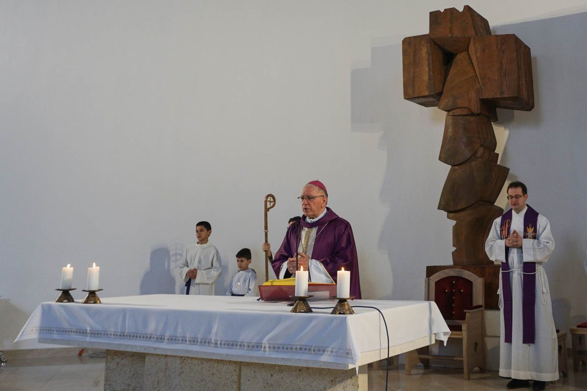 Na početku je biskup rekao da pozdravlja sudionike slavlja „od srca i s radošću“. „Od srca“ zato što pred Boga trebamo uvijek nastupiti srcem koje mu vjeruje, a „radosno“, jer se i ove korizme zaustavljamo pred Isusovim križem i onim što je Bog po njem za nas ostvario – pobjedu nad smrću. Kazao je da ga veseli što im na Drugu korizmenu nedjelju može predati drveni Križ, umjetničko djelo akademika Šime Vulasa, postavljen u svetište njihove župne crkve. Kazao je da taj Križ na svoj način povezuje Biskupiju i Župu, i da će on uskoro biti sastavnim dijelom slavlja posvete oltara i cijele nove crkve njihove mlade župne zajednice.