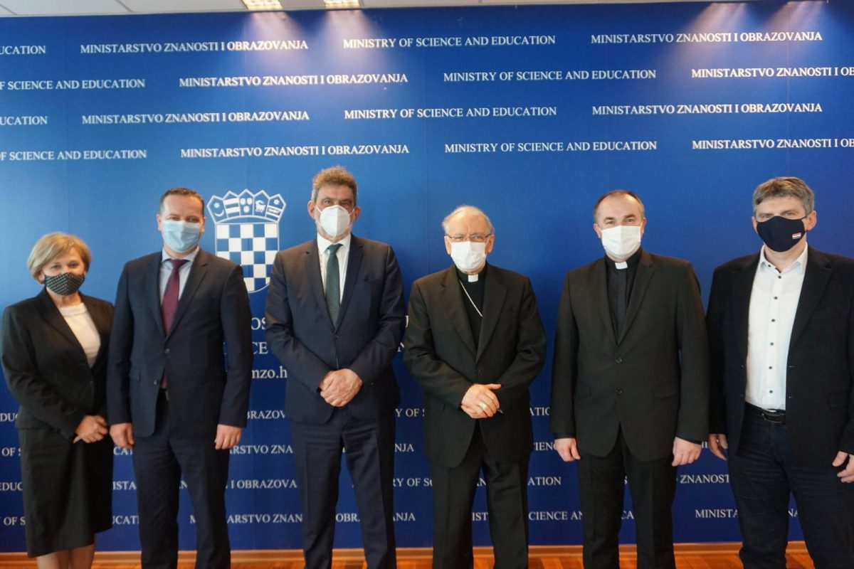 Biskup i ministar prisjetili su se uspješne suradnje koju su imali 2011. u vrijeme ministrova prvog mandata pri izradi Ugovora o katoličkim osnovnim i srednjim školama, provedbenom dokumentu Ugovora Svete Stolice i Republike Hrvatske o suradnji na području odgoja i kulture te izrazili zadovoljstvo što mogu ponovno zajednički djelovati na njihovoj implementaciji. U svojstvu članova navedenih Komisija razmotrili su dosadašnji rad i razgovarali o načinu koji bi trebalo slijediti u daljnjem nastojanju oko provedbe spomenutog međunarodnog Ugovora. Utvrdili su neka pitanja formalne naravi koja se odnose na mjesto katoličkih škola u odgojno-obrazovnom sustavu Republike Hrvatske, povezano napose s izradom njihova specifičnog kurikula u skladu s ugovorima. Dotaknuli su se i nekoliko konkretnih aktualnih pitanja i problema iz djelovanja katoličkih škola. Osvrnuli su se među ostalim i na zakonski okvir unutar kojeg Ministarstvo i lokalne jedinice trebaju učenicima katoličkih škola pružati materijalnu potporu putem decentraliziranih sredstava.