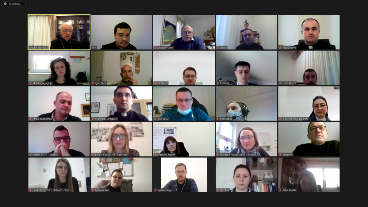 Sjednica je započela molitvom Svetom Josipu koju je napisao papa Franjo u svom Apostolskom pismu Patris corde. Potom je prisutne, među kojima i predsjednika Vijeća HBK za katolički odgoj i obrazovanje msgr. Antuna Škvorčevića, pozdravio predstojnik Nacionalnog ureda Ivica Žuljević podsjetivši ih na ulogu koju imaju Biskupijski uredi za katoličke škole i Vijeće Nacionalnog ureda u sustavu katoličkih škola u Republici Hrvatskoj. U prigodnoj riječi biskup Antun Škvorčević uputio je najprije pozdrav predstojnicima Biskupijskih ureda za katoličke škole te ravnateljima i ravnateljicama. Zahvalio im je za sve što čine u svojim službama, podsjetivši ih na odgovornost koju imaju za djelovanje katoličke škole u njihovoj mjesnoj Crkvi. Naglasio je kako su međusobni susreti, pa i na način videokonferencije, važni jer djelatnici katoličkih škola nastoje tim putem jedni druge čuti i jedni druge pomagati. Spomenuo je kako ga u razmišljanjima o katoličkim školama trajno prati izazovna činjenica da smo se upustili u jednu od najdragocjenijih djelatnosti, oblikovanje i izgradnju mladih ljudi na mjeru Evanđelja i tako im pomagati da se snađu u svijetu. Nema važnijeg poslanja od služenja mladom čovjeku! Kazao je da okolnosti u kojima se odvija odgojno-obrazovno djelovanje katoličkih škola nisu nimalo jednostavne, ne samo zbog koronavirusa i potresa, nego što društvena situacija u Hrvatskoj i u svijetu ide vrtoglavim putem u nepoznato, gdje je mladima zaista potrebna svjetlost evanđelja. Zato je važno, nastavio je biskup, da djelatnici katoličkih škola, osim stručne osposobljenosti u služenju mladima, budu izgrađeni na duhovnoj razini. Zadaća je ravnatelja i predstojnika biskupijskih ureda za katoličke škole da u oblikovanju školskih planova i programa na prvo mjesto stave duhovnu dimenziju, jer duhovno prazna osoba ne može pravo pristupiti tako važnom djelovanju kao što je evanđeosko služenje mladom čovjeku u njegovoj izgradnji. Biskup je zahvalio sudionicima video-konferencije za nastojanja koja čine u školama u navedenom smislu. Još je dodao da je potrebna povezanost među katoličkim školama, zajedničko propitkivanje, međusobni dosluh kako bi one što bolje vršile poslanje koje im je povjereno, čemu služi i Nacionalni ured. Poželio je plodan rad sudionicima video-konferencije.